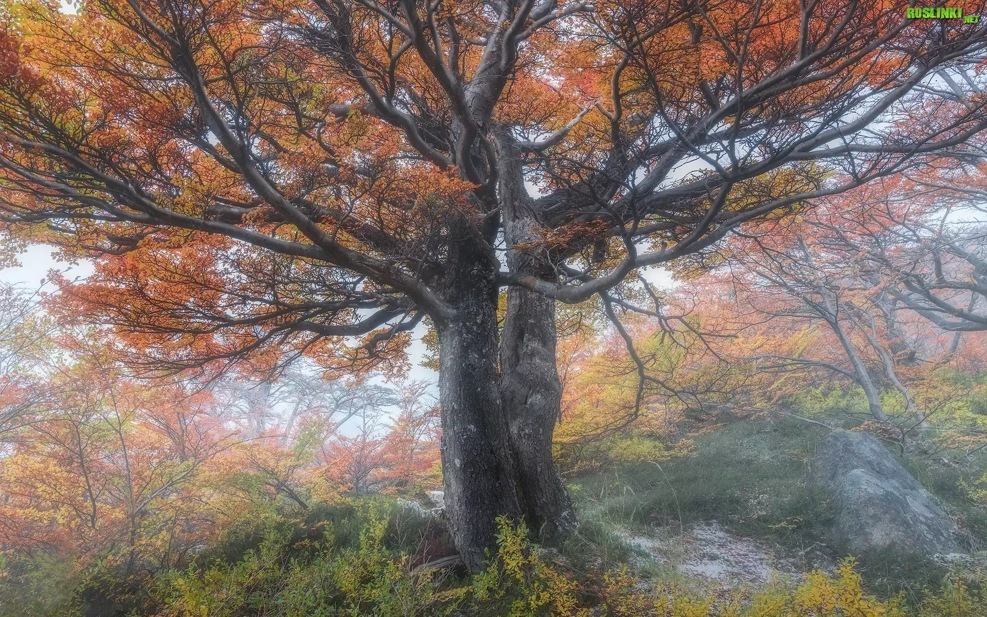 Rośliny: Drzewo, Jesień, Mgła