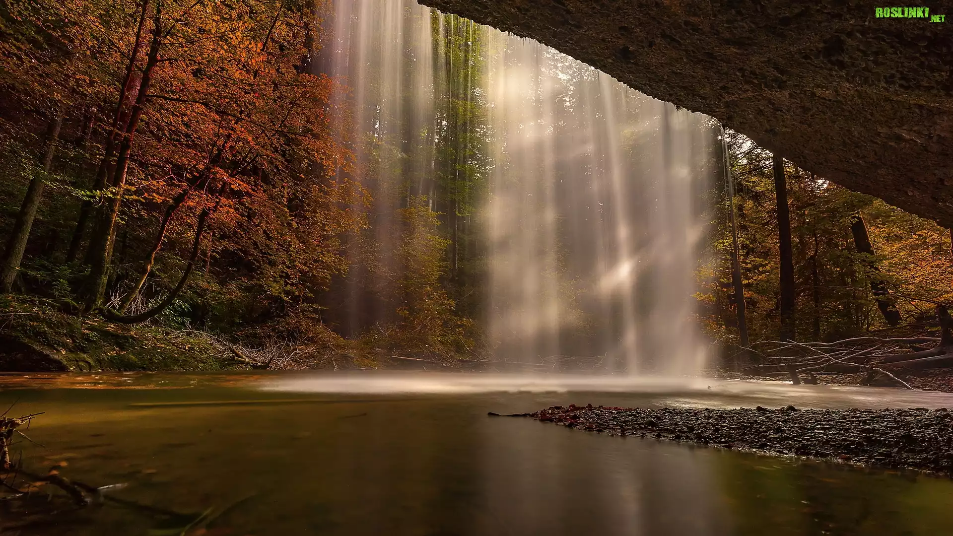 Rośliny: Jesień, Wodospad, Las, Drzewa, Gałęzie, Skała