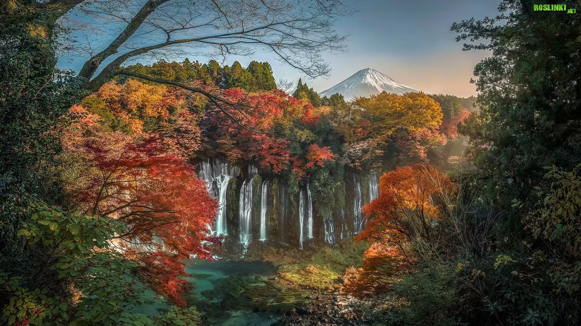Jesień, Liście, Drzewa, Gałęzie, Wieczór, Wodospad Shiraito, Park Narodowy Fudżi-Hakone-Izu, Japonia |