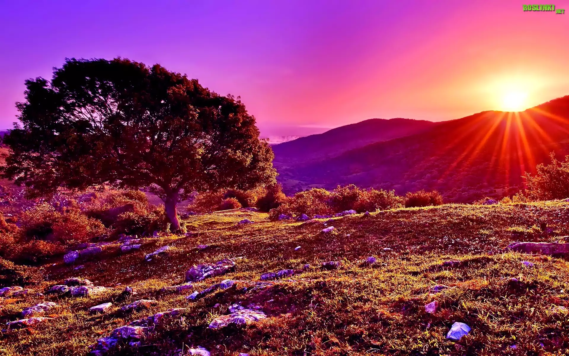 Rośliny: Jesień, Góry, Drzewo, Wschód słońca