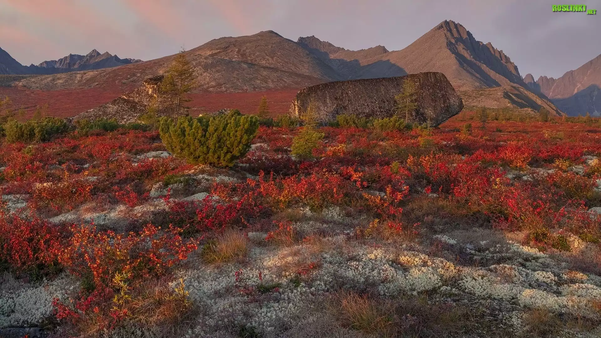 Rośliny: Jesień, Góry Kołymskie, Czerwone, Rośliny, Skały, Iglak, Kołyma, Rosja