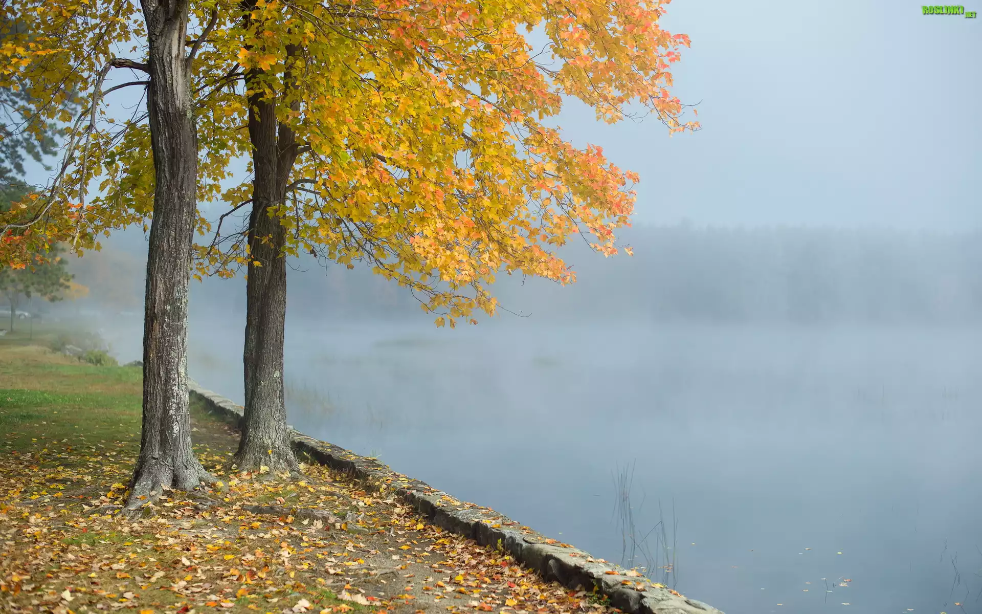 Rośliny: Jesień, Drzewa, Jezioro, Mgła