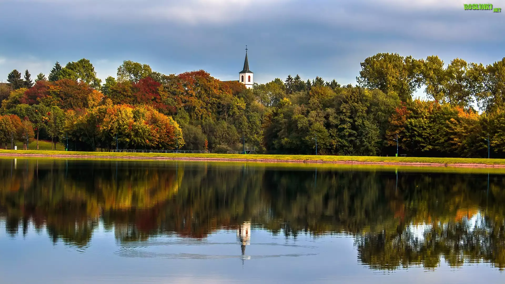 Rośliny: Jesień, Drzewa, Wieżyczka, Kościół, Jezioro, Odbicie