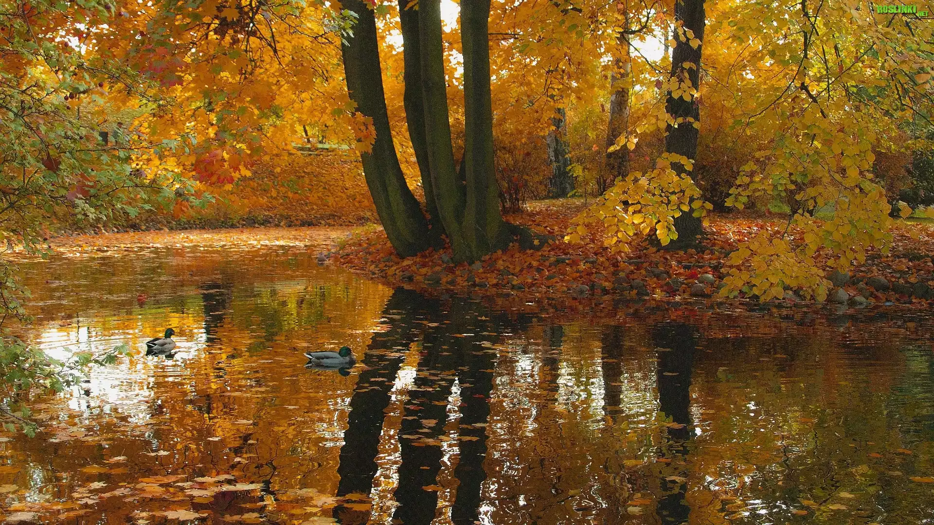 Rośliny: Jesień, Odbicie, Drzewa, Kaczki, Staw
