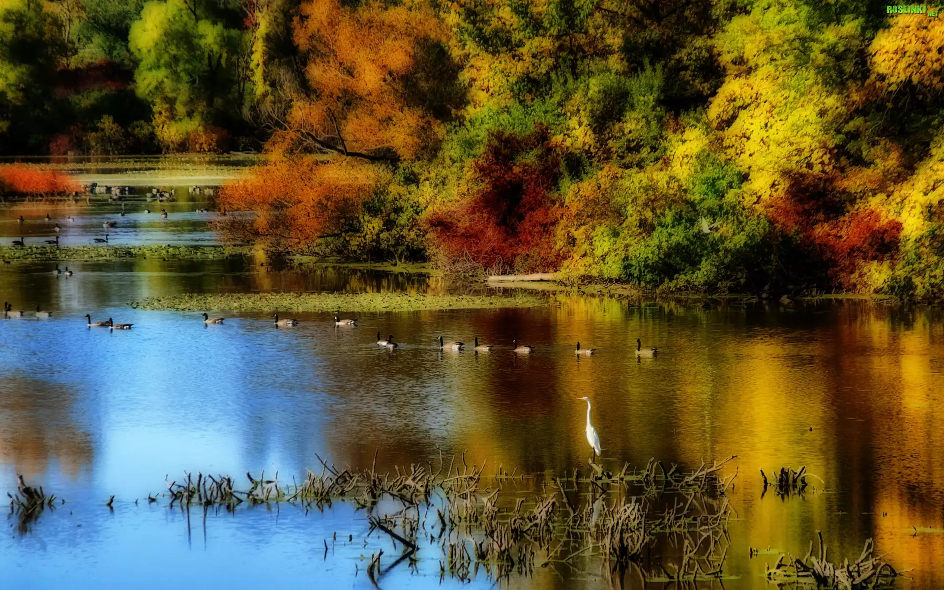 Rośliny: Jesień, Jezioro, Kaczki, Drzewa