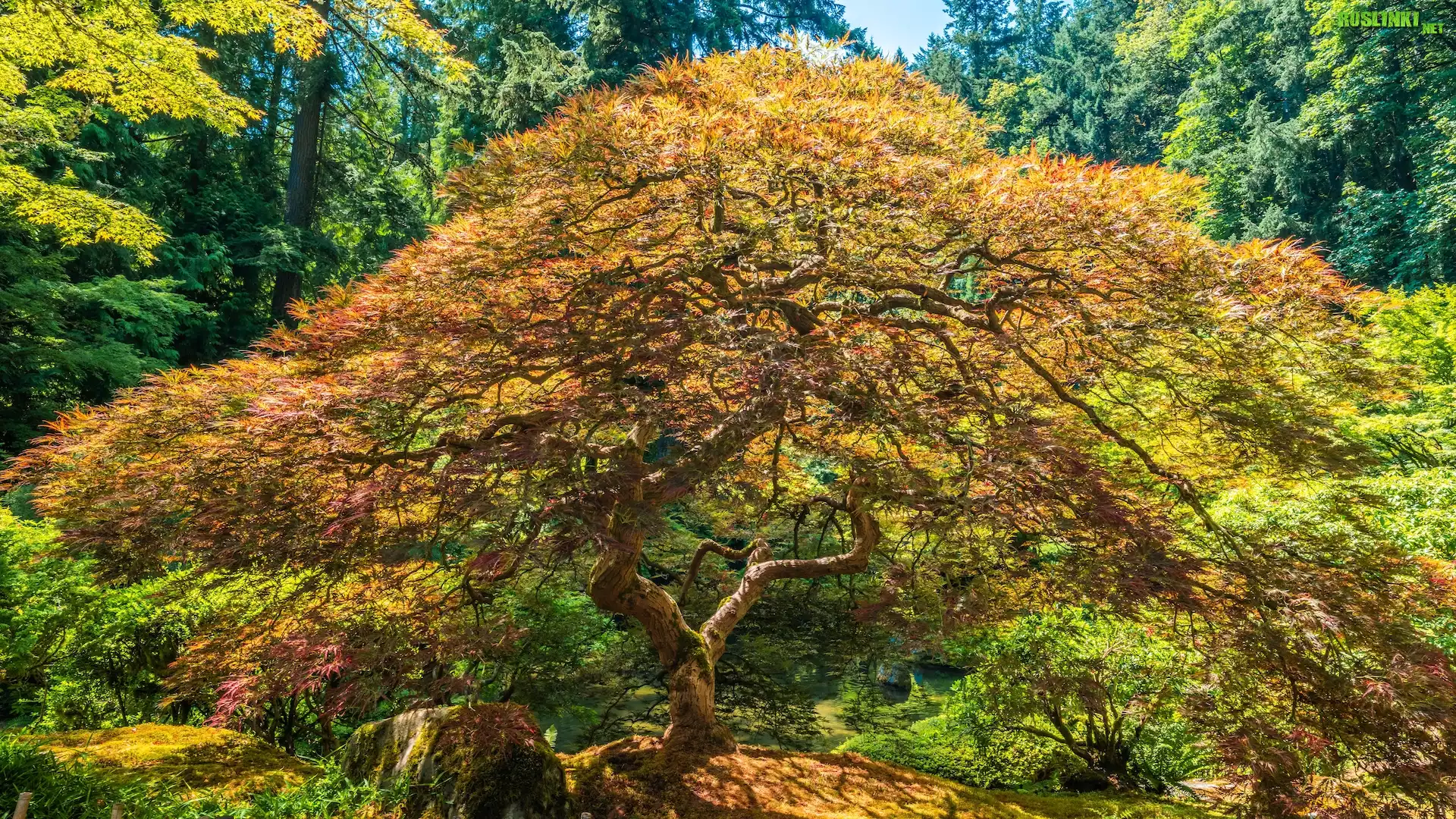 Ogród japoński, Jesień, Drzewo, Klon palmowy, Portland, Stan Oregon, Stany Zjednoczone