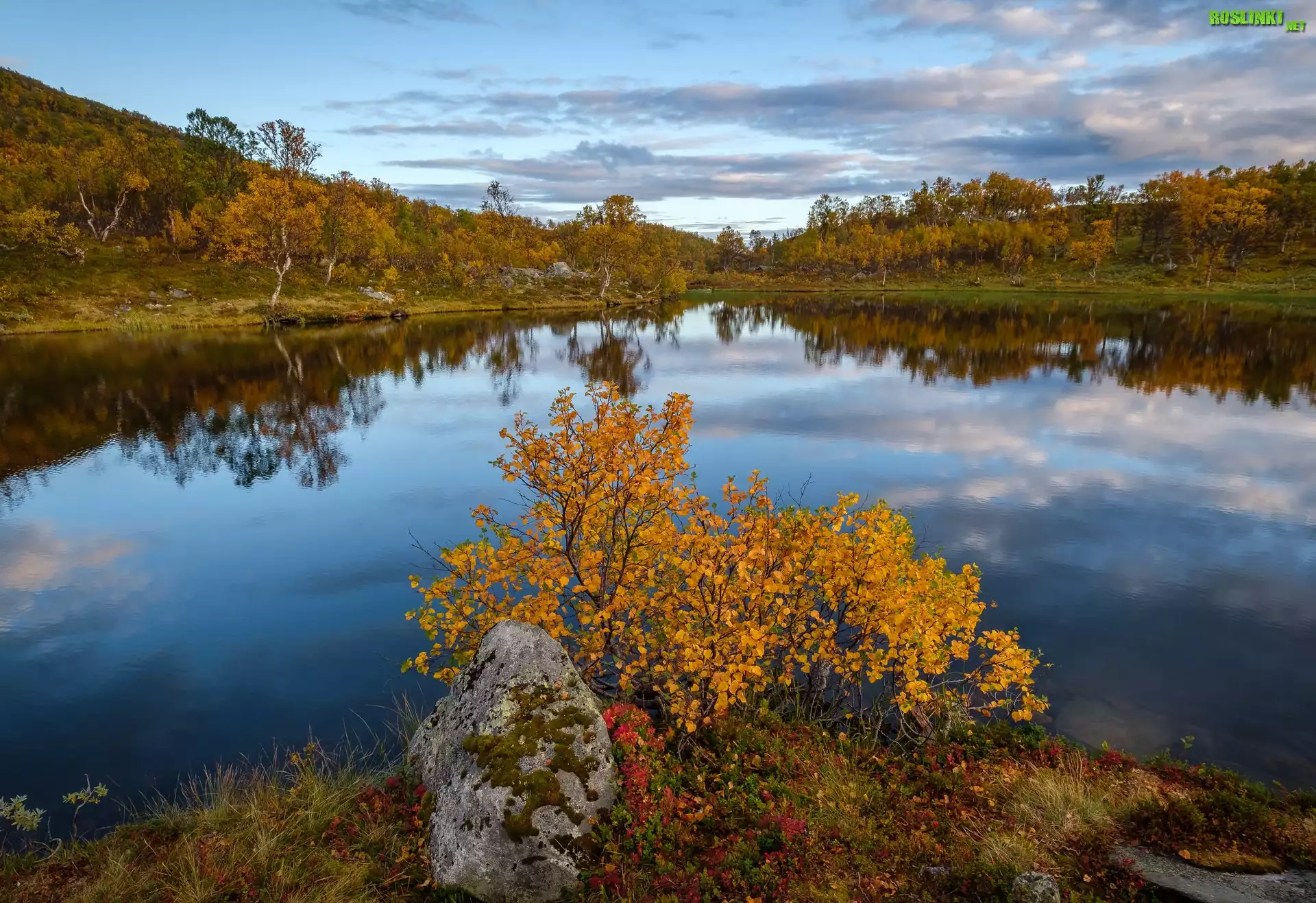Rośliny: Jesień, Jezioro, Drzewa, Krzew, Kamień