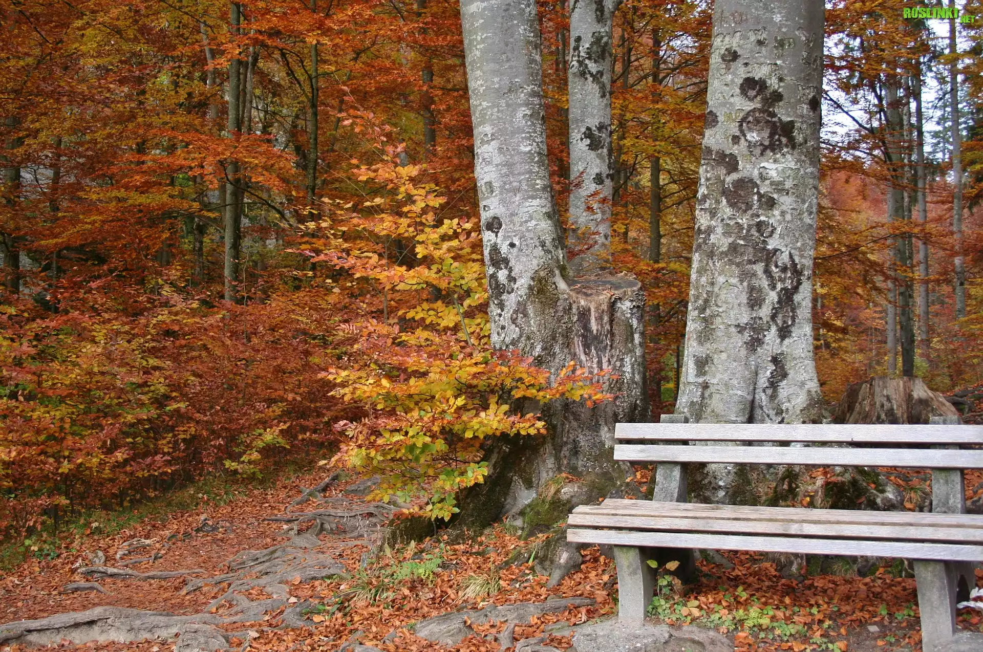 Rośliny: Jesień, Las, Drzewa, Krzewy, Ławka