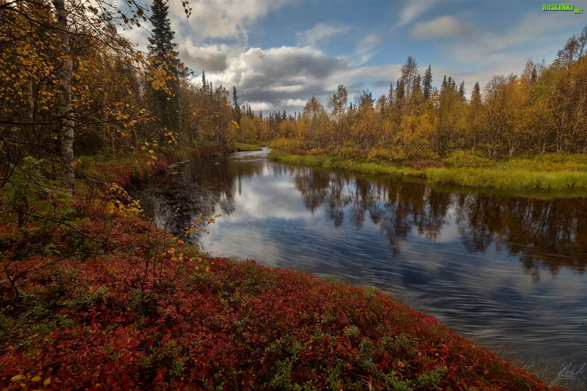 Rośliny: Jesień, Rzeka, Drzewa, Krzewy, Chmury