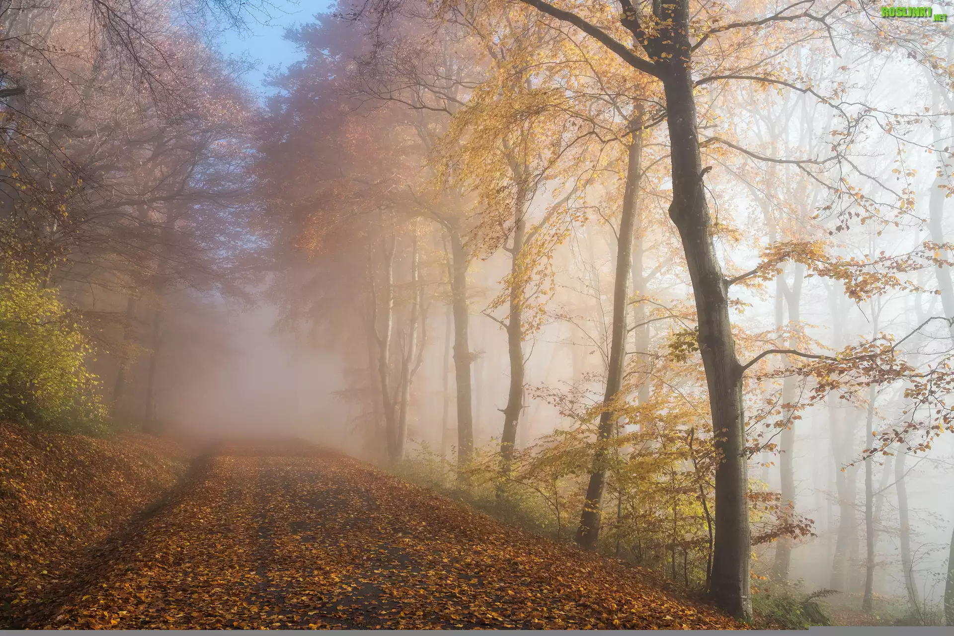 Rośliny: Jesień, Droga, Mgła, Las, Drzewa