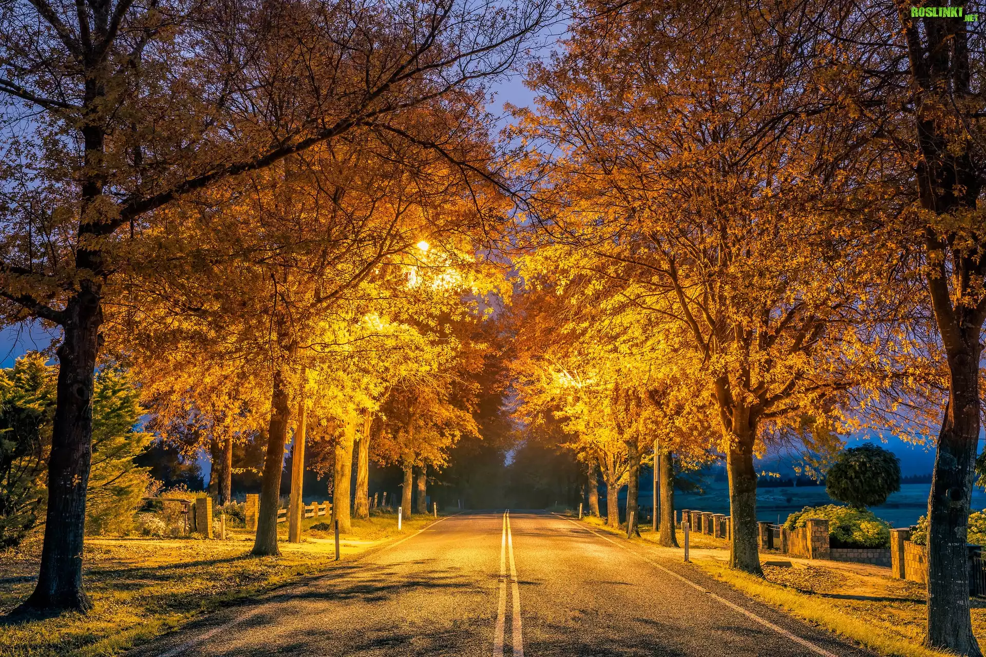 Rośliny: Jesień, Droga, Drzewa, Latarnie, Noc