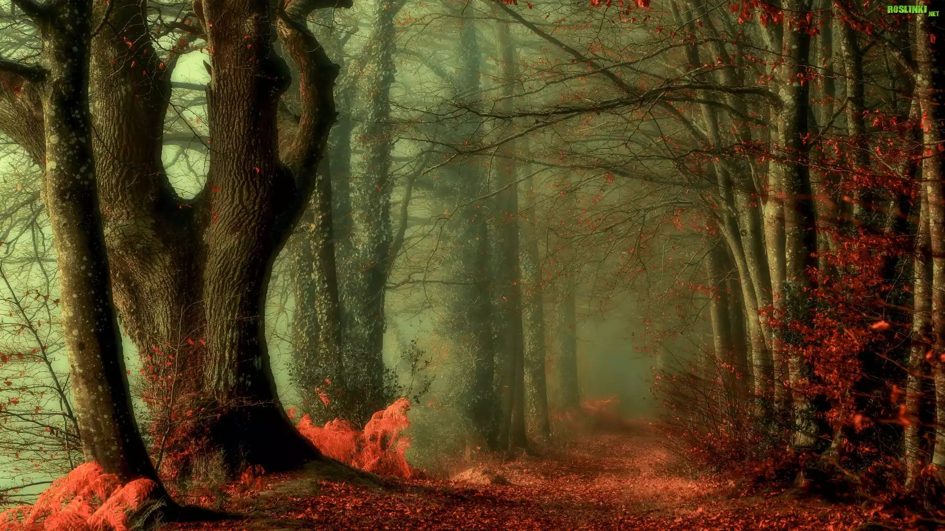 Rośliny: Jesień, Las, Droga, Drzewa, Liście, Mgła