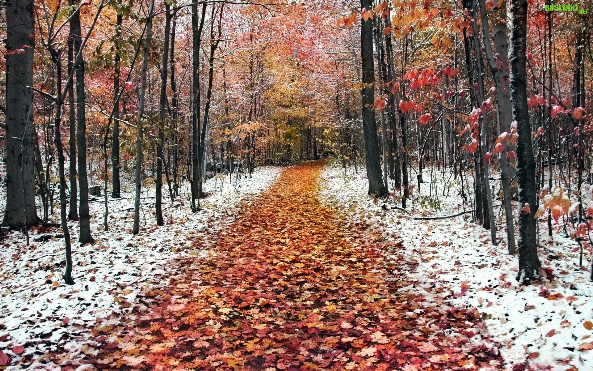 Rośliny: Jesień, Las, Droga, Liście, Śnieg