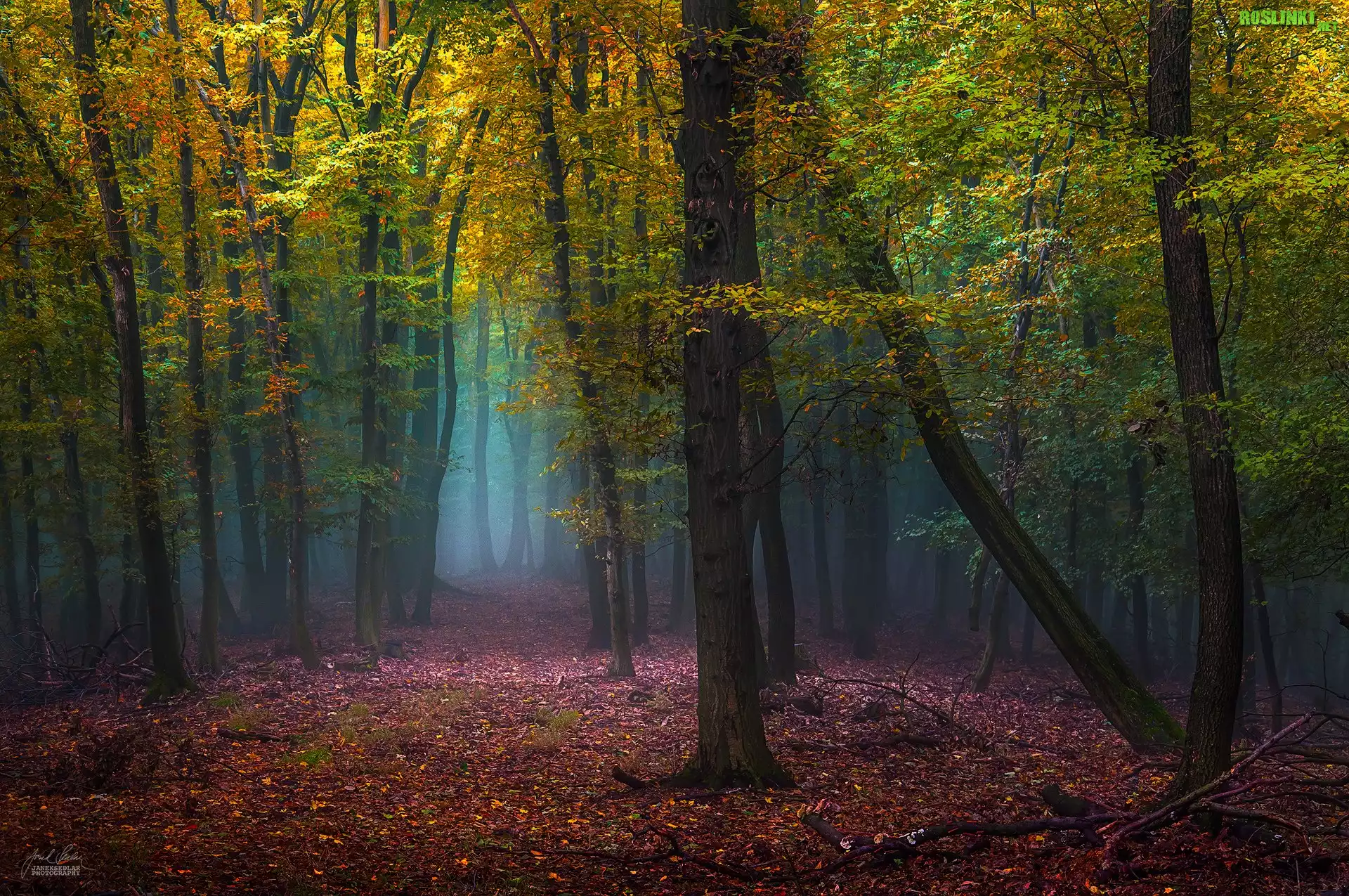 Rośliny: Jesień, Las, Drzewa, Liście, Mgła