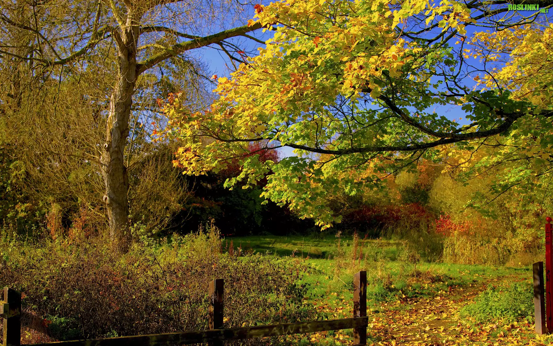 Rośliny: Jesień, Las, Drzewa, Żółte, Liście, Ogrodzenie