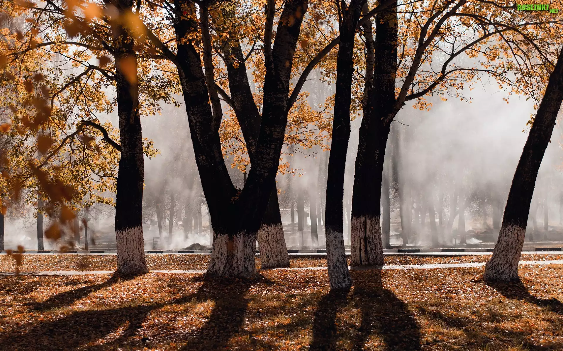 Rośliny: Jesień, Park, Drzewa, Pożółkłe, Liście, Mgła