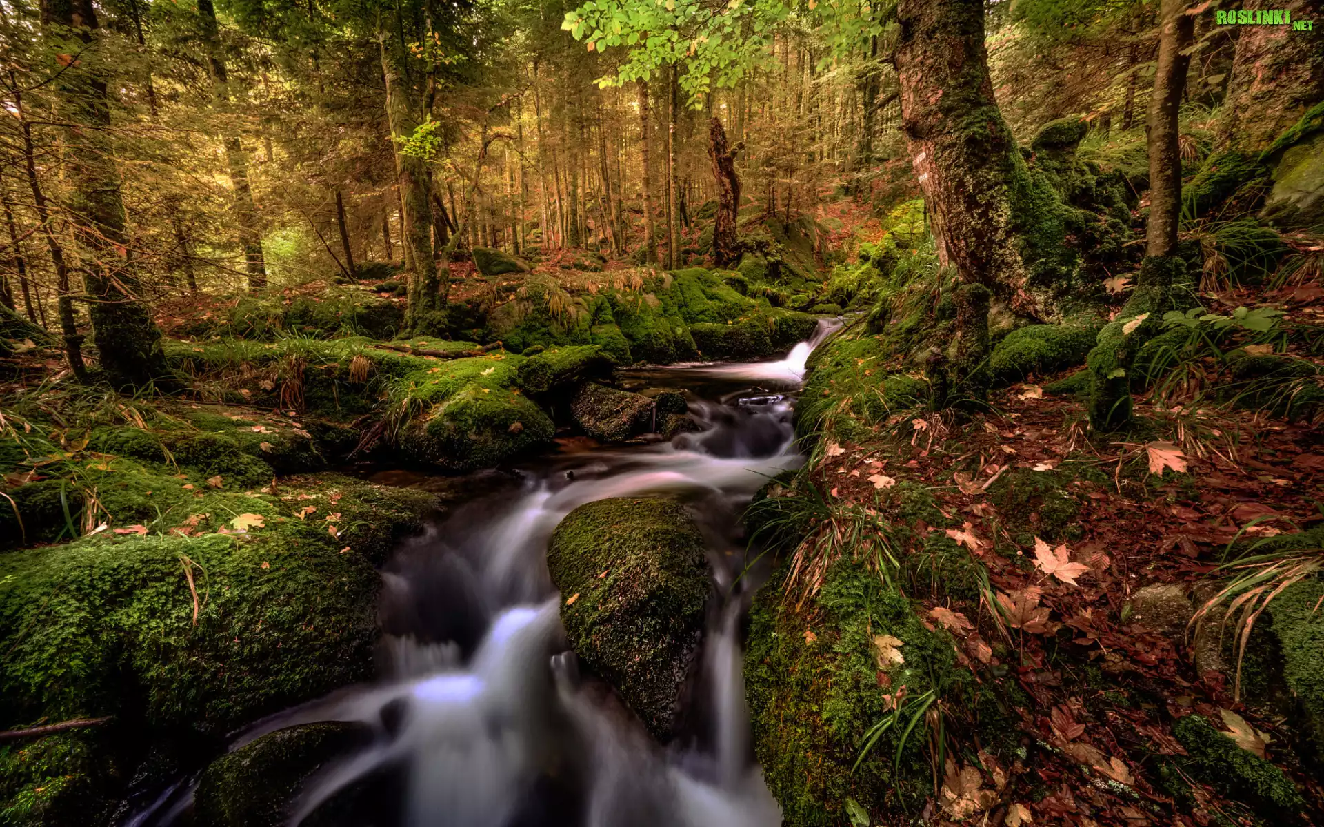 Rośliny: Jesień, Las, Drzewa, Strumień, Liście, Mech