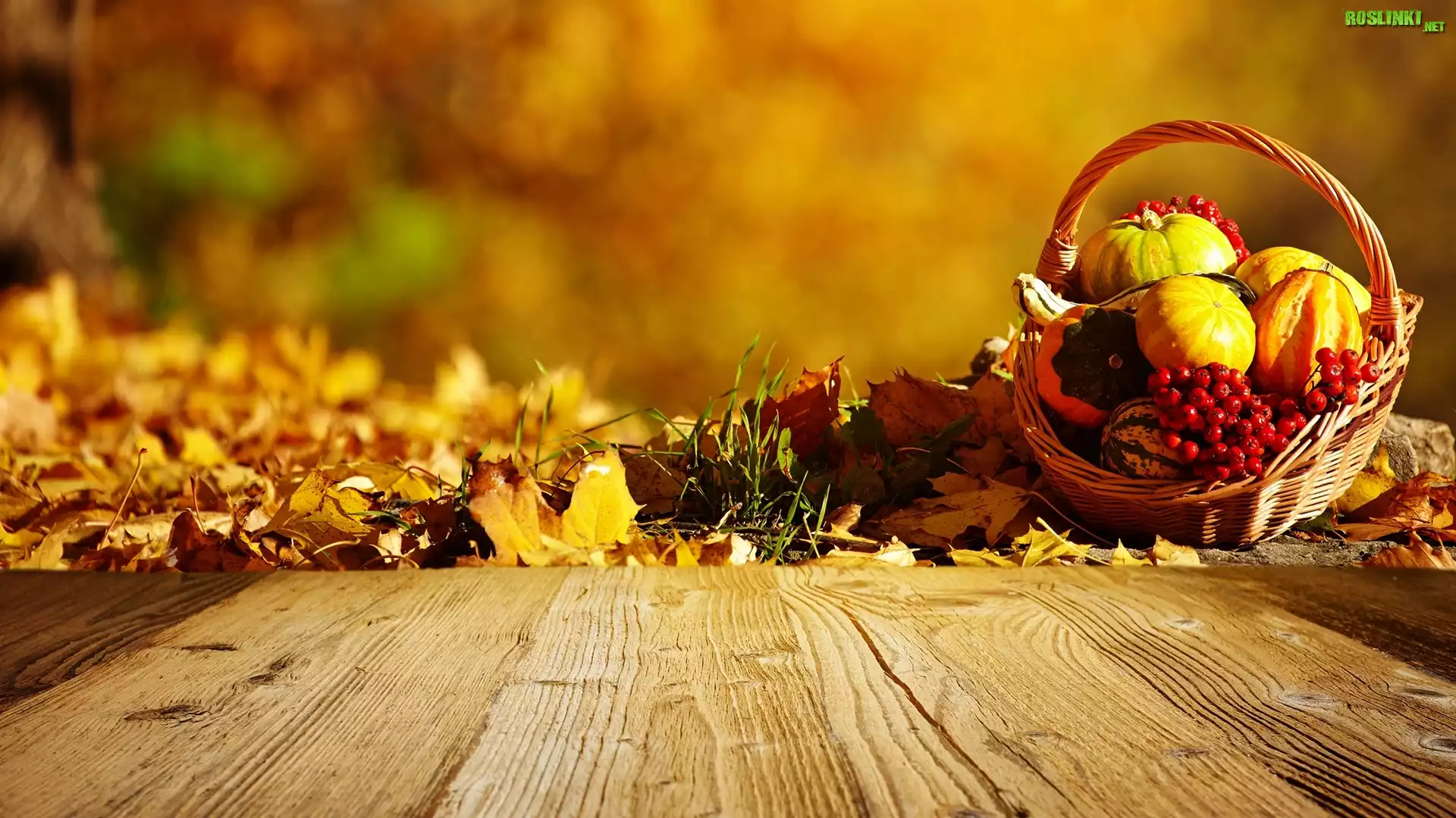 Rośliny: Jesień, Koszyk, Dynie, Jarzębina, Liście, Deski