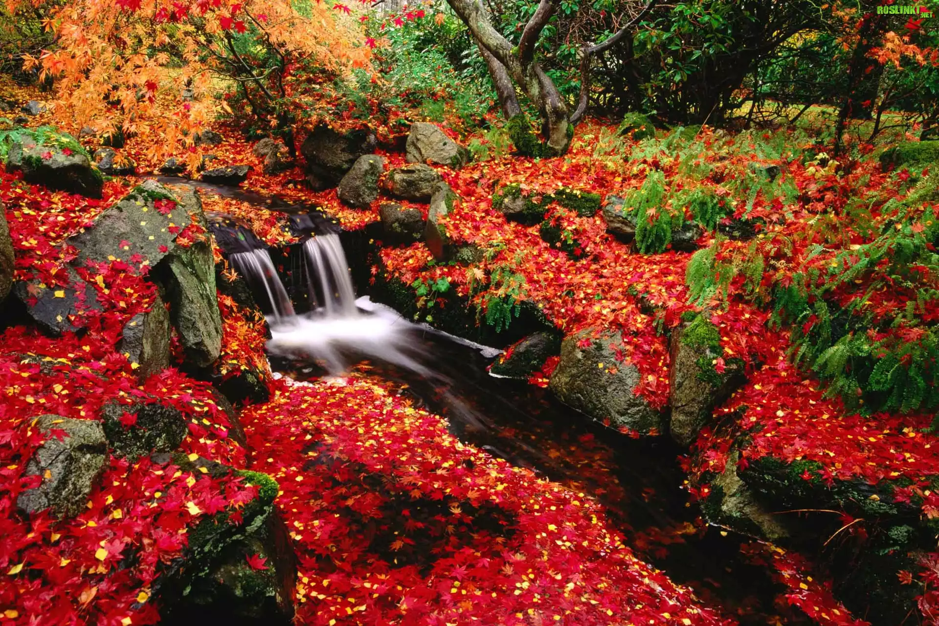 Rośliny: Jesień, Wodospad, Kamienie, Liście, Drzewa