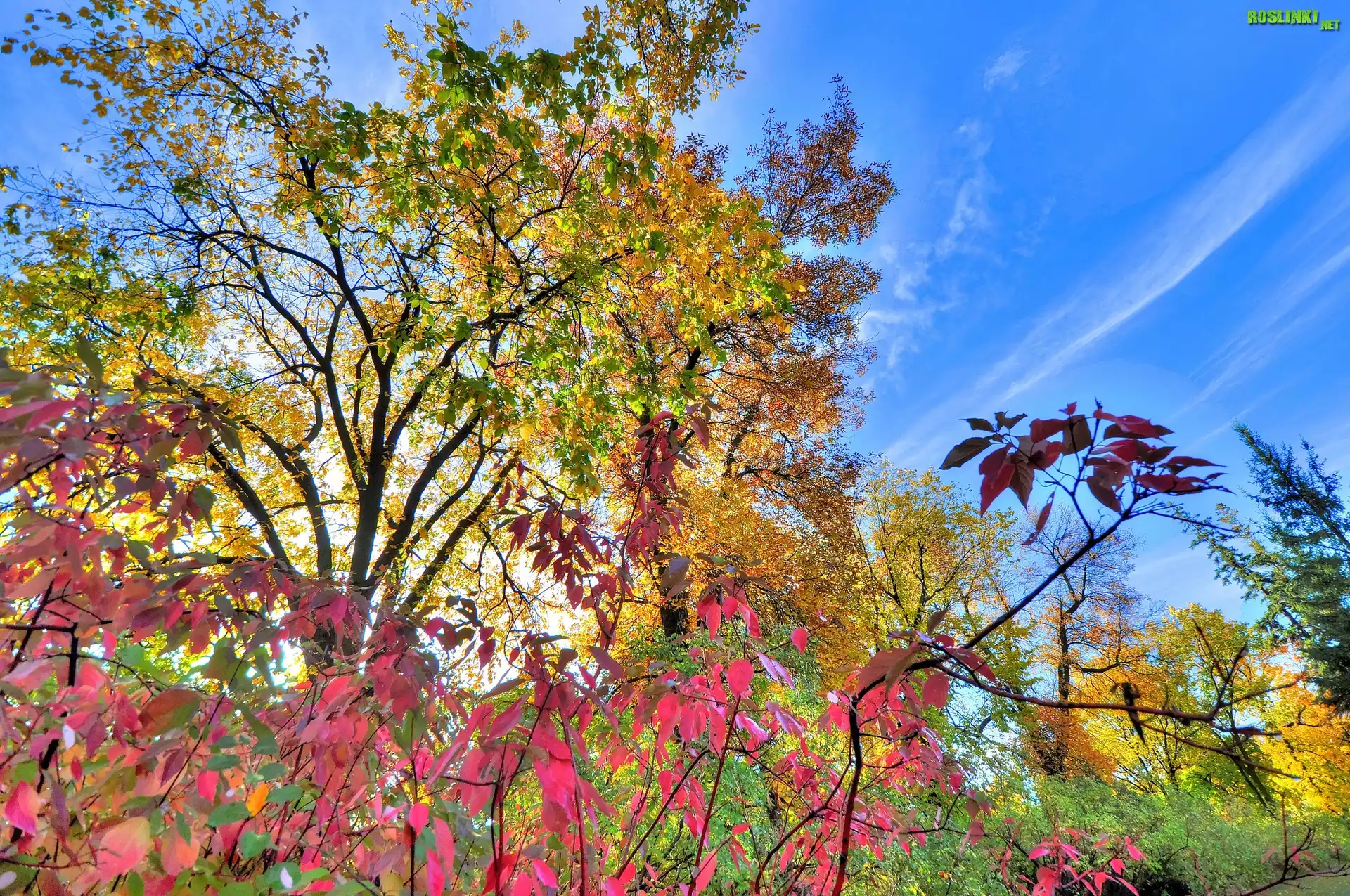 Rośliny: Jesień, Drzewa, Krzewy, Kolorowe, Liście, Niebo