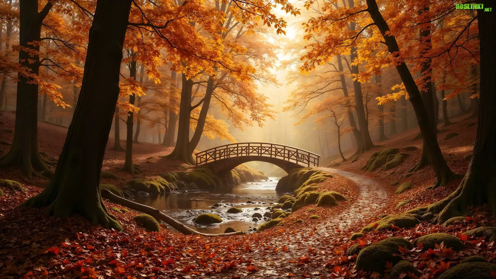 Rośliny: Jesień, Las, Mostek, Rzeka, Drzewa, Pożółkłe, Liście, Ścieżka, AI