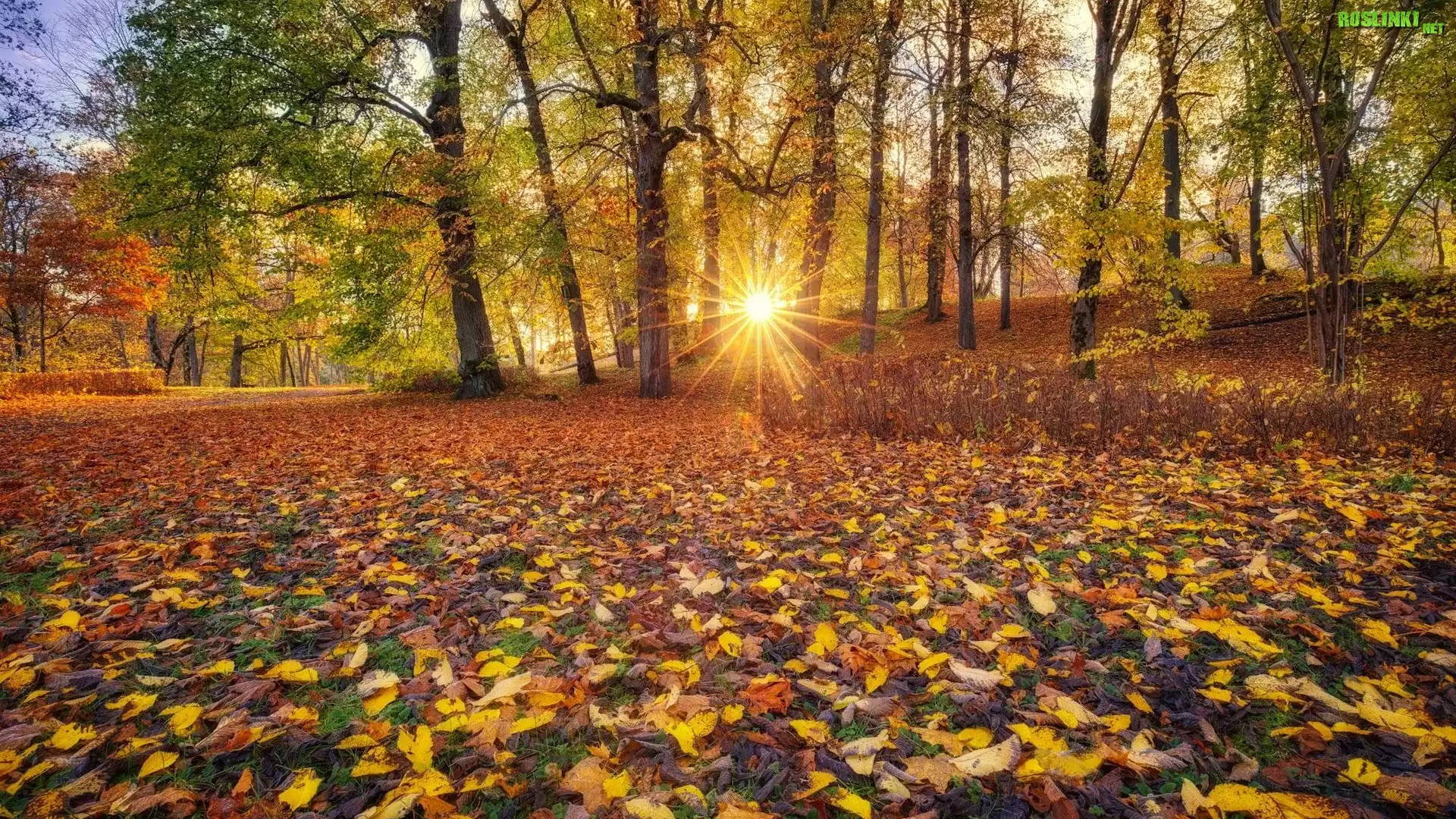 Rośliny: Jesień, Promienie słońca, Drzewa, Liście, Park