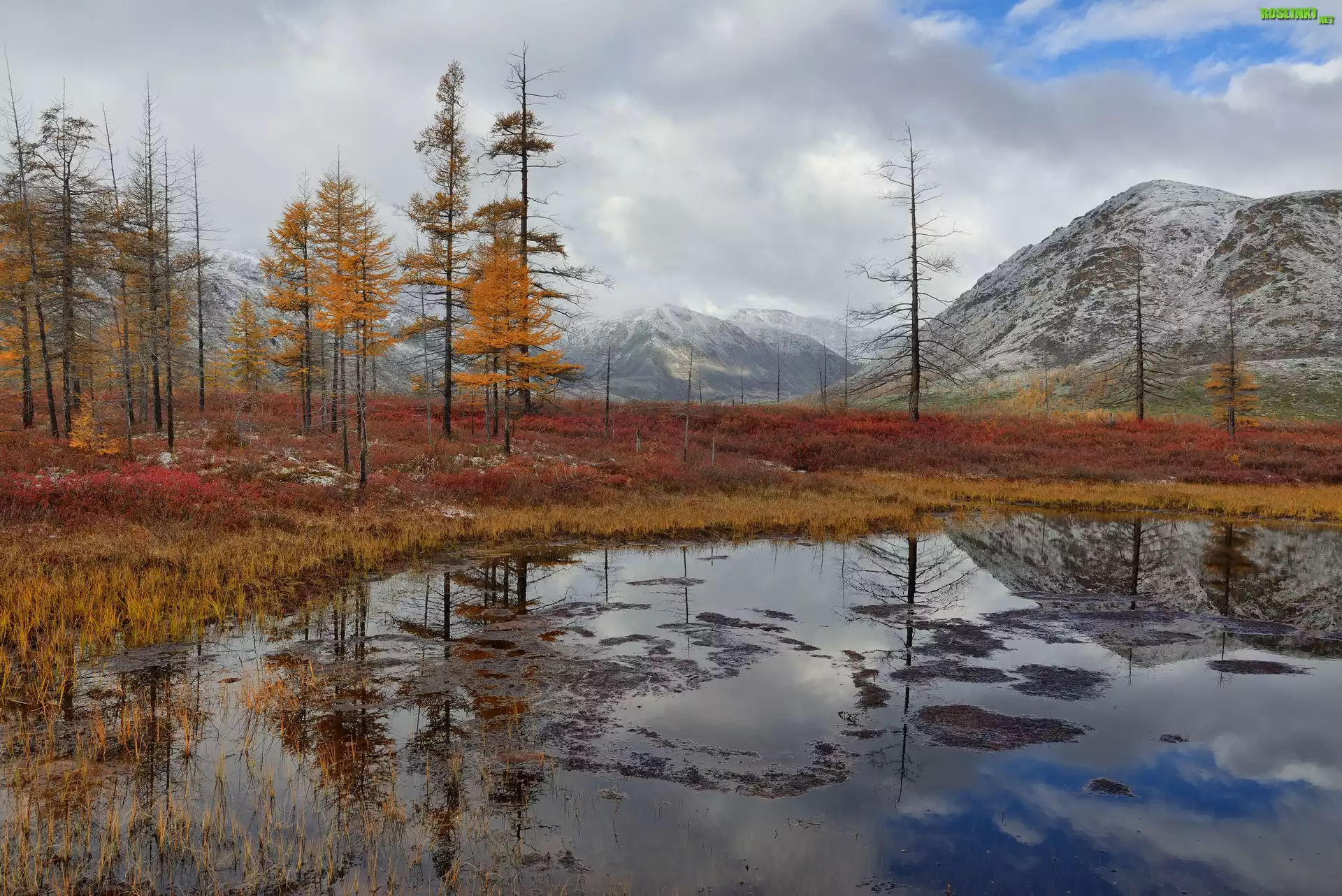Jesień, Jezioro Jack London, Góry Kołymskie, Drzewa, Mgła, Rośliny, Kamienie, Odbicie, Kołyma, Obwód magadański, Rosja |