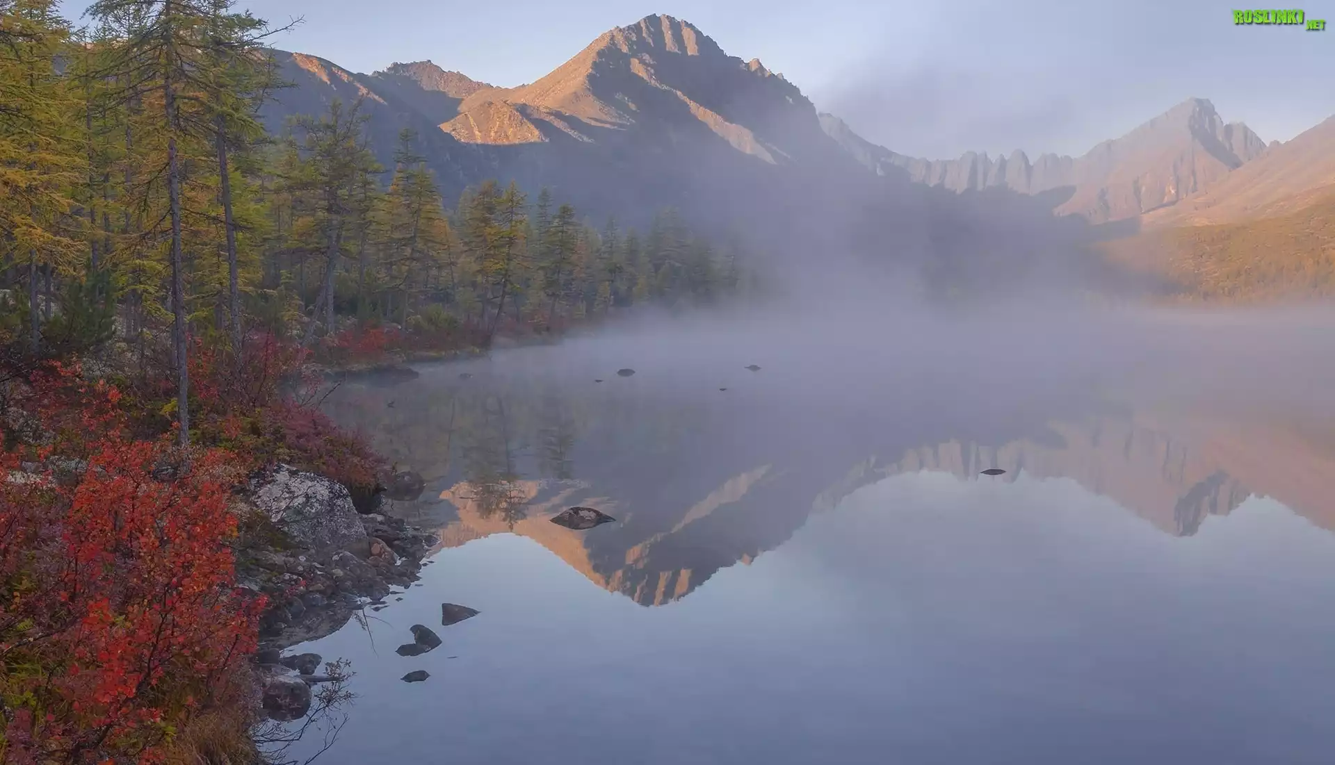 Jesień, Jezioro Jack London, Mgła, Drzewa, Krzewy, Odbicie, Góra Angachak, Góry Kołymskie, Kołyma, Obwód magadański, Rosja |