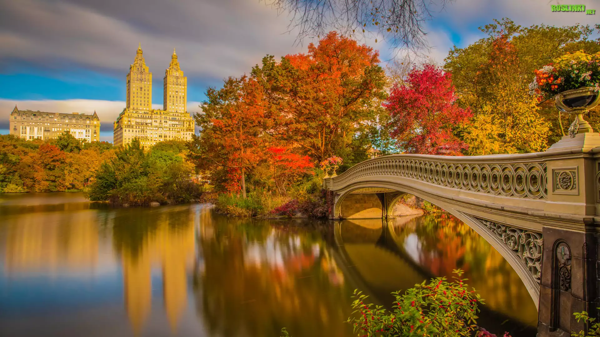 Jesień, Nowy Jork, Manhattan, Central Park, Budynek Eldorado, Drzewa, Jezioro, Most, Stany Zjednoczone |