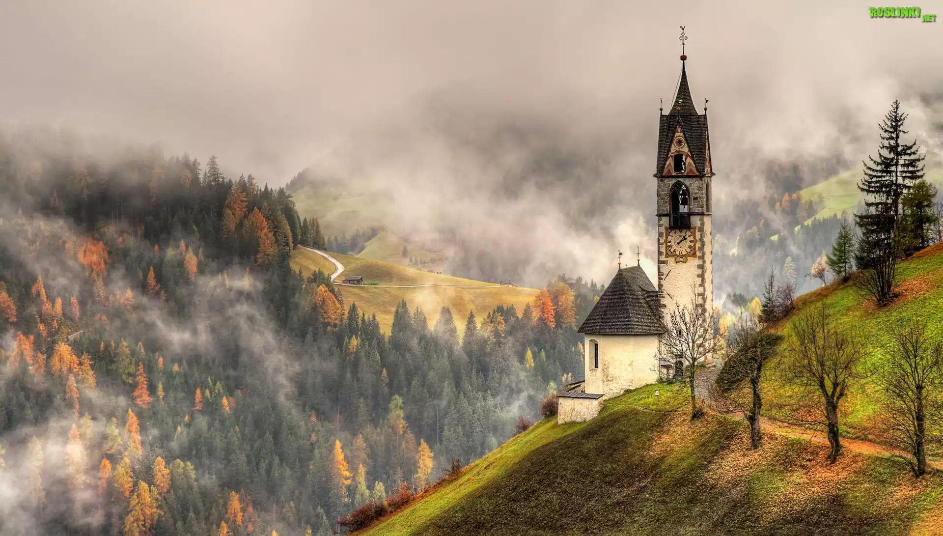 Rośliny: Jesień, Góry, Droga, Kościółek, Mgła, Drzewa