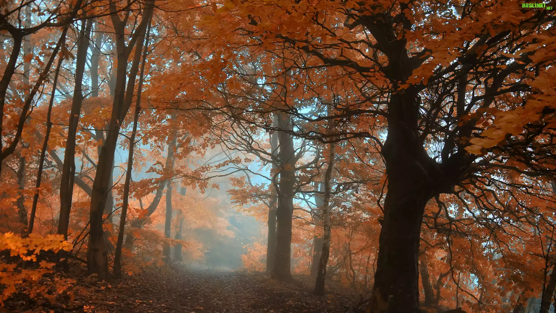 Rośliny: Jesień, Las, Drzewa, Mgła, Droga
