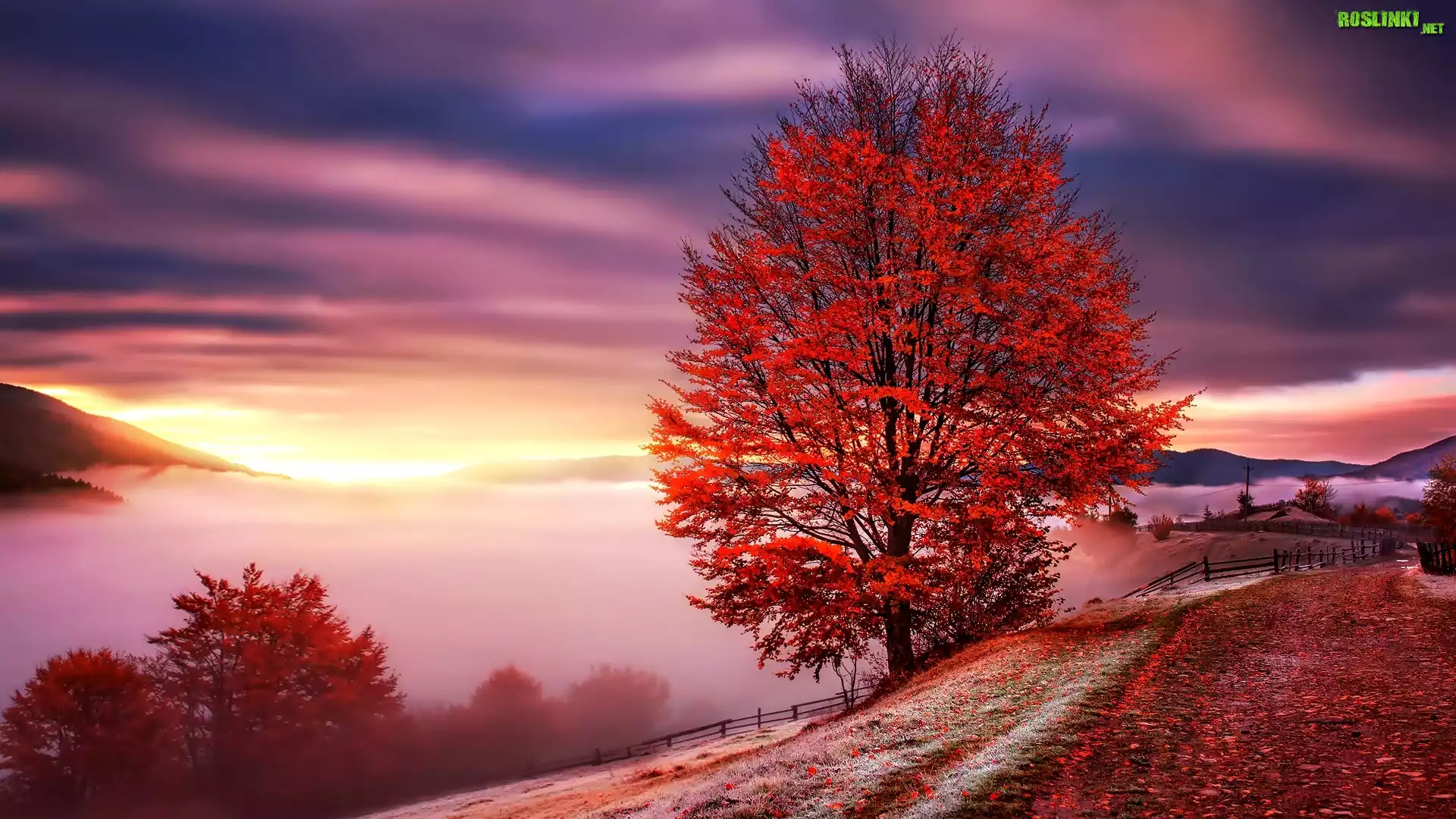 Rośliny: Jesień, Drzewa, Góry, Mgła, Ścieżka