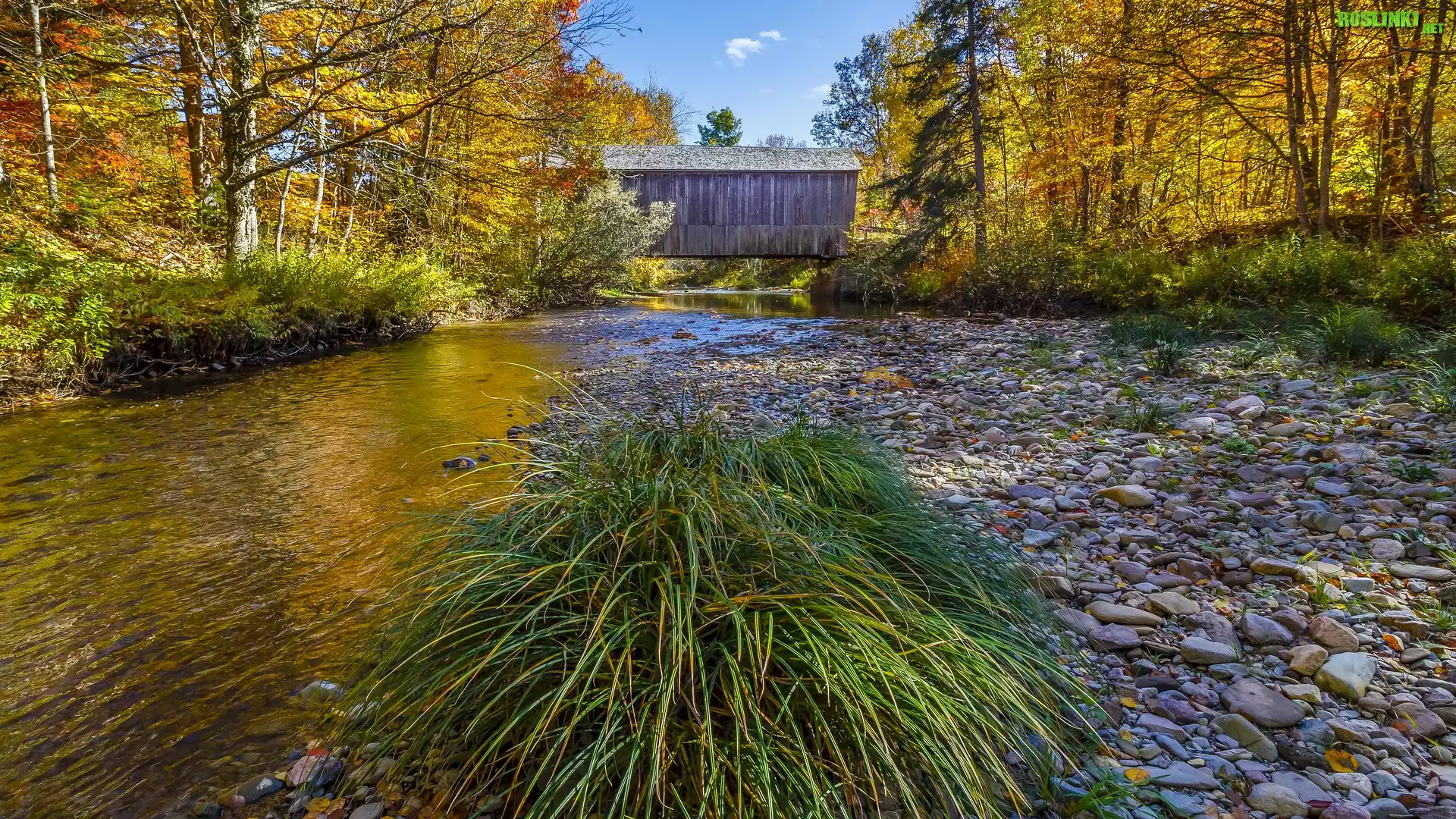 Rośliny: Rzeka, Jesień, Drzewa, Kępka, Trawy, Drewniany, Zakryty, Most