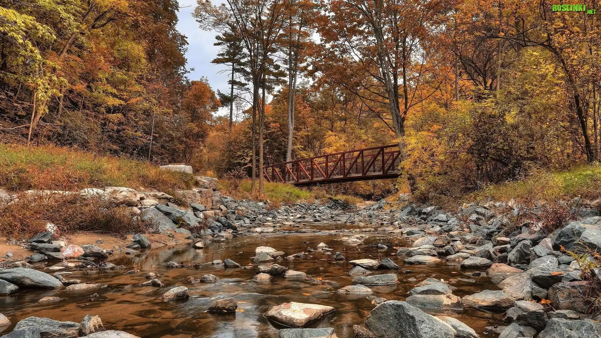 Rośliny: Jesień, Drzewa, Rzeka, Most, Kamienie