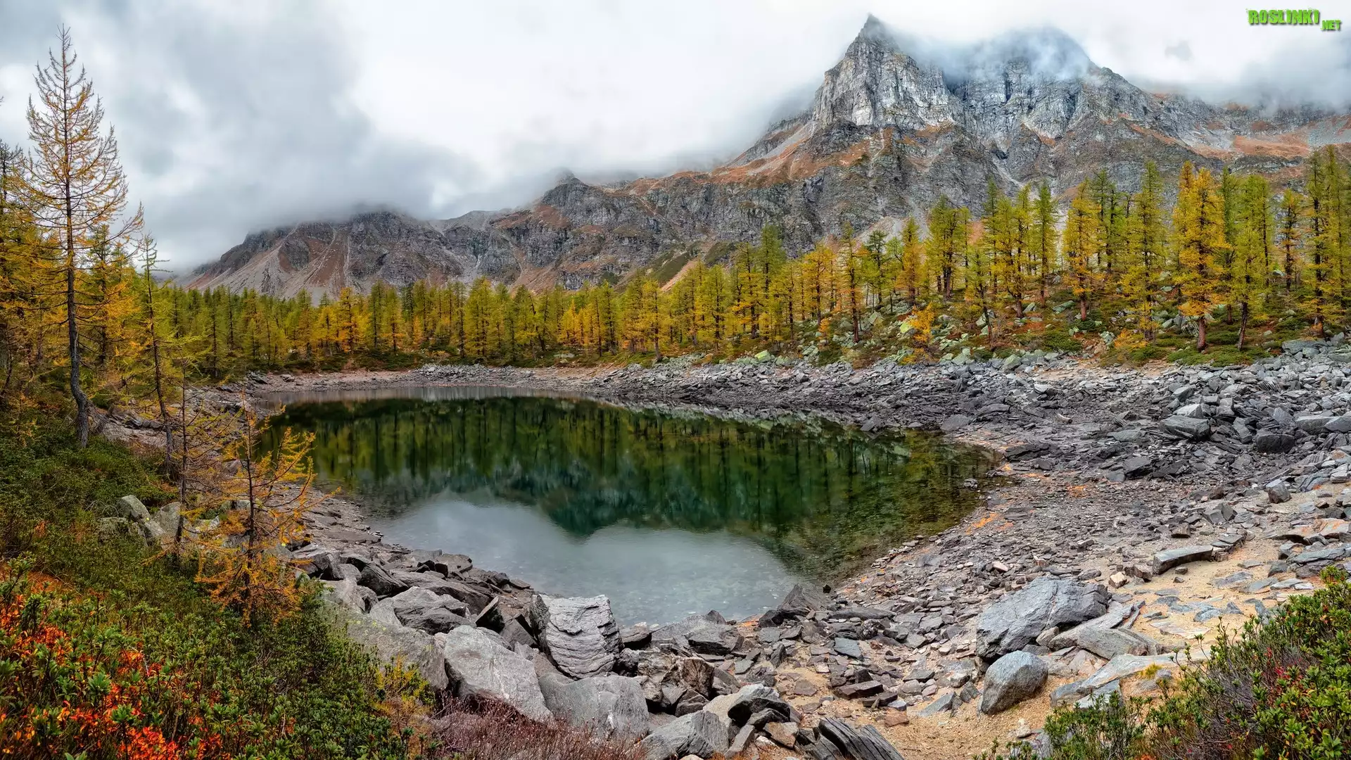 Rośliny: Jesień, Góry, Mgła, Żółte, Drzewa, Kamienie, Jezioro, Lago Nero, Włochy
