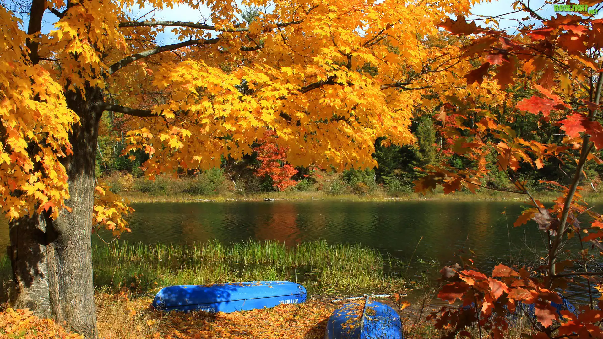Rośliny: Jesień, Jezioro, Łódki, Drzewa