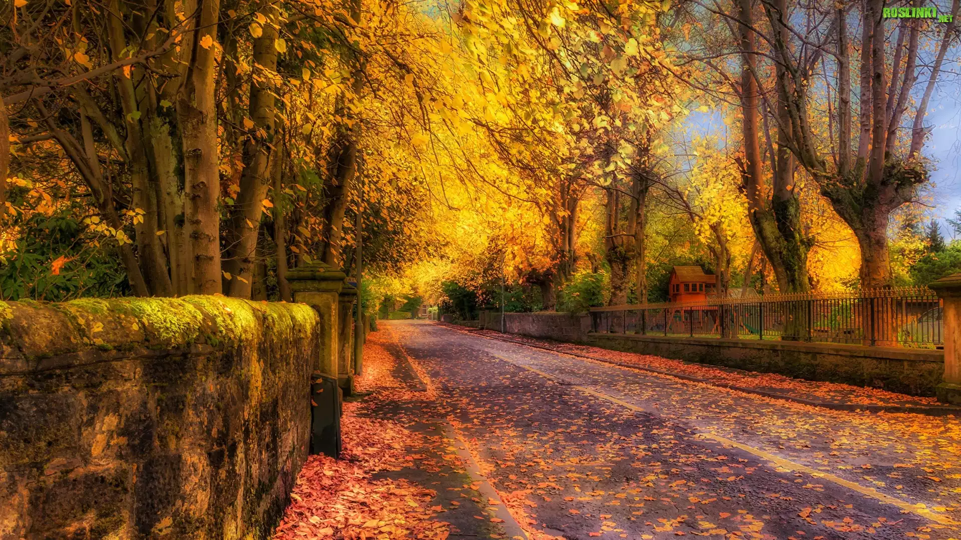 Rośliny: Jesień, Drzewa, Droga, Liście, Ogrodzenie, HDR