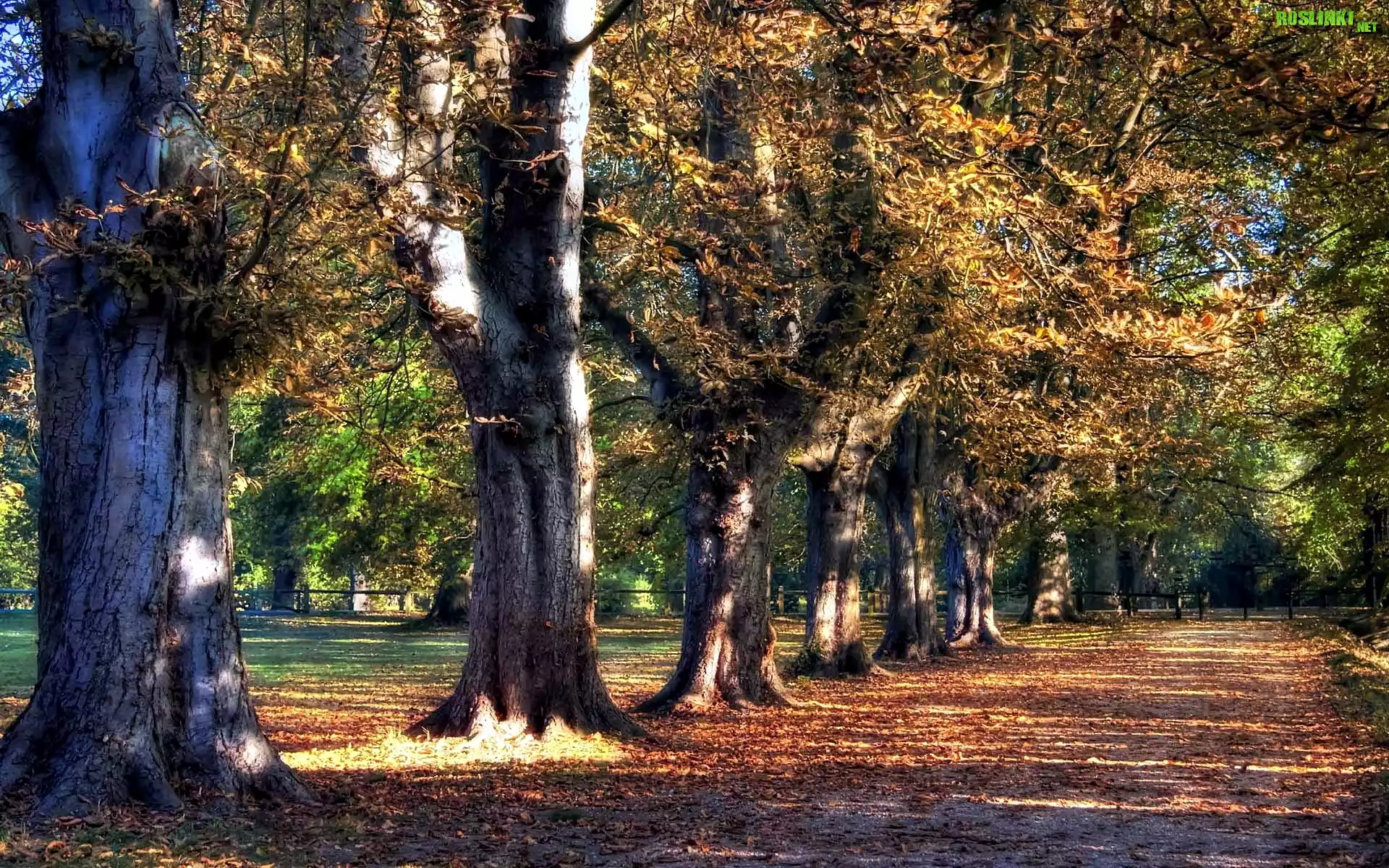 Jesień, Park, Aleja, Dęby, Opadłe, Liście