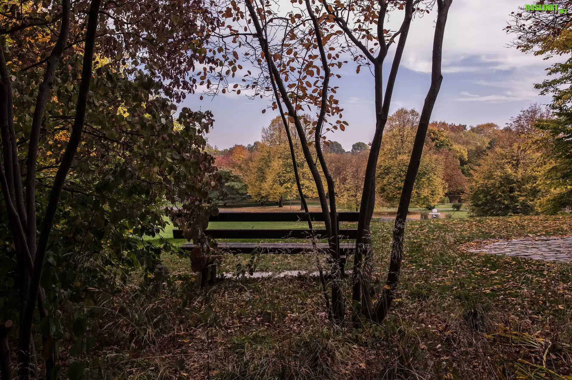 Rośliny: Jesień, Park, Ławka, Drzewa, Opadłe, Liście