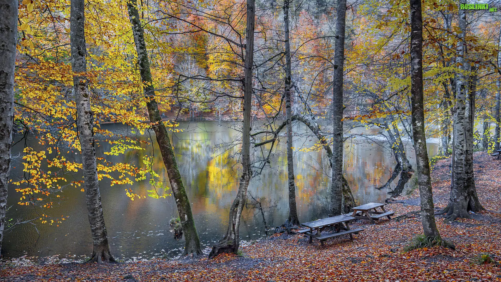 Rośliny: Jesień, Rzeka, Brzozy, Ławki, Opadłe, Liście