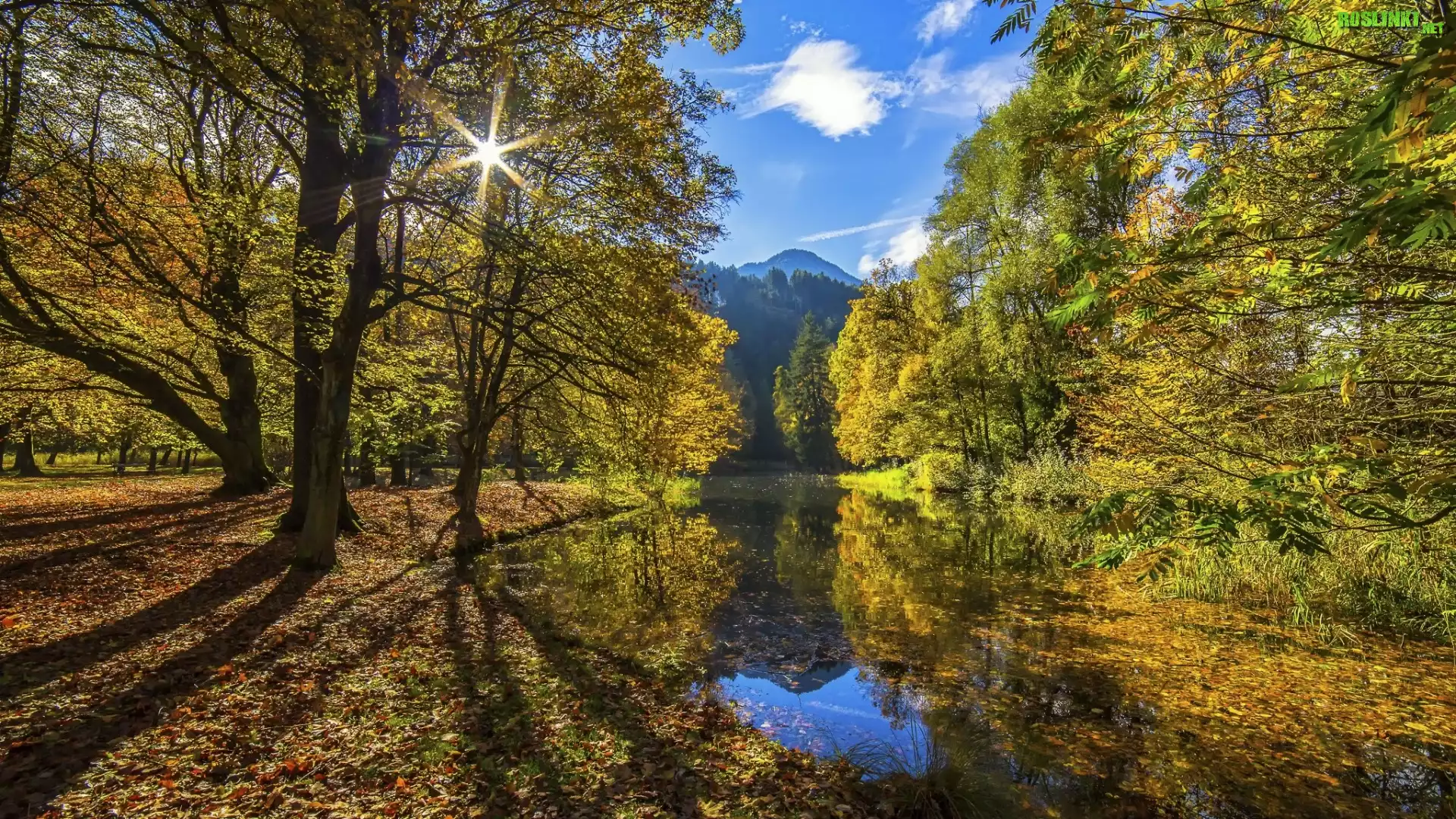 Rośliny: Jesień, Drzewa, Rzeka, Promienie słońca