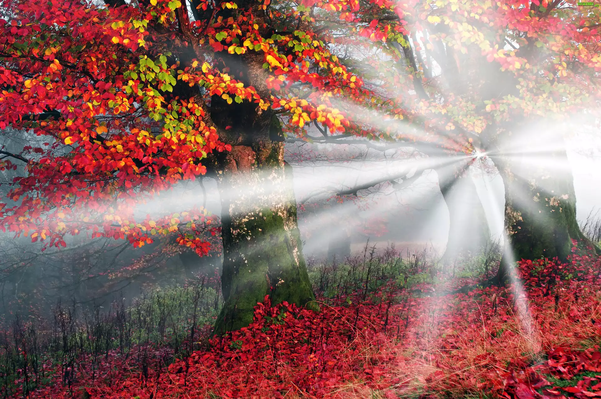 Rośliny: Jesień, Drzewa, Świt, Promienie słońca