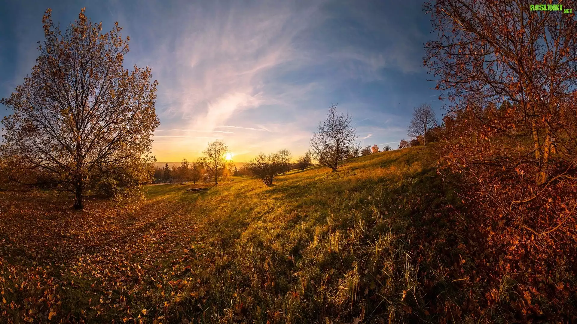 Rośliny: Jesień, Drzewa, Wzgórza, Promienie słońca
