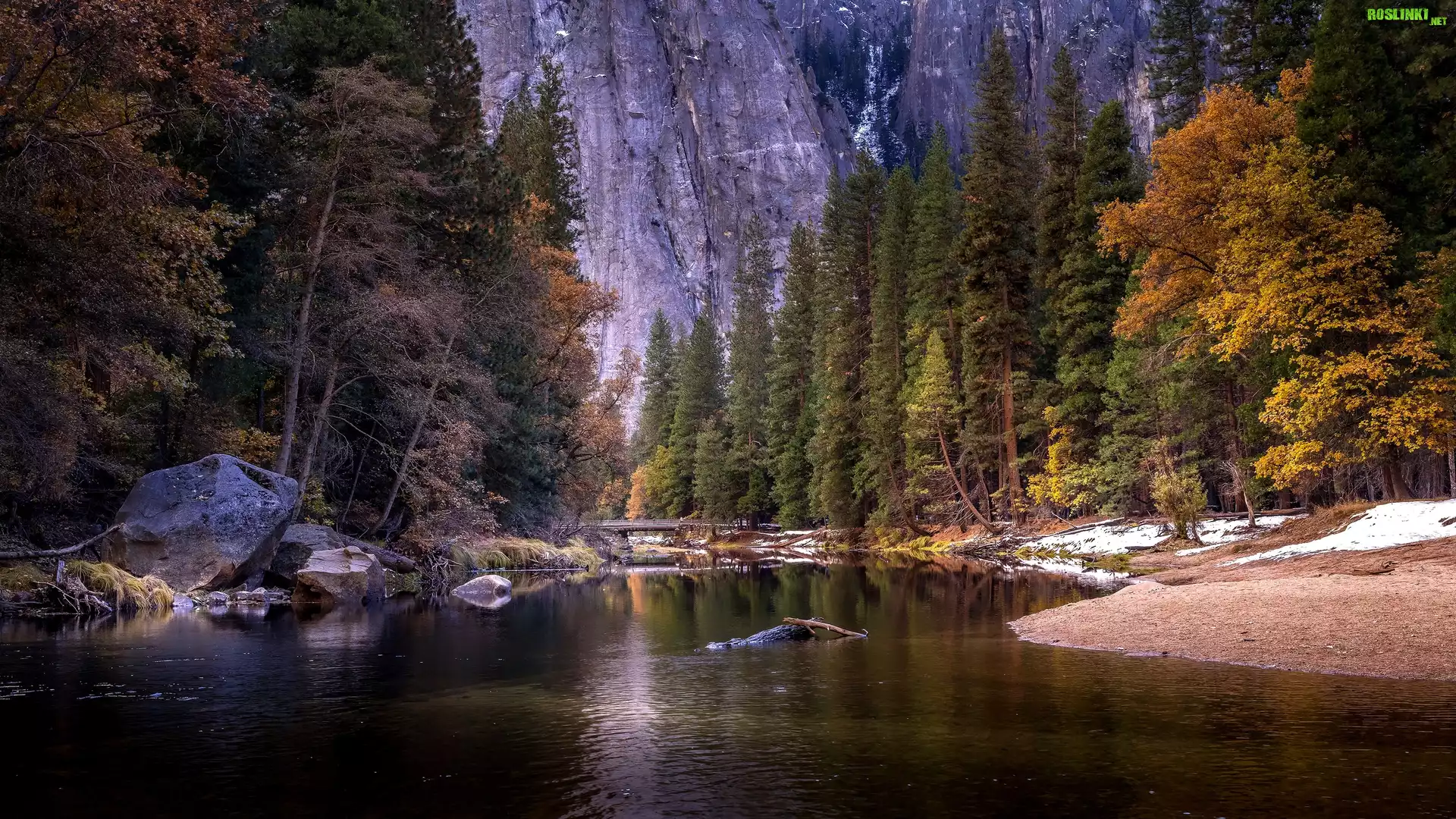 Jesień, Las, Drzewa, Góry, Skały, Brzeg, Rzeka, Merced River, Kamienie, Most, Park Narodowy Yosemite, Kalifornia, Stany Zjednoczone |