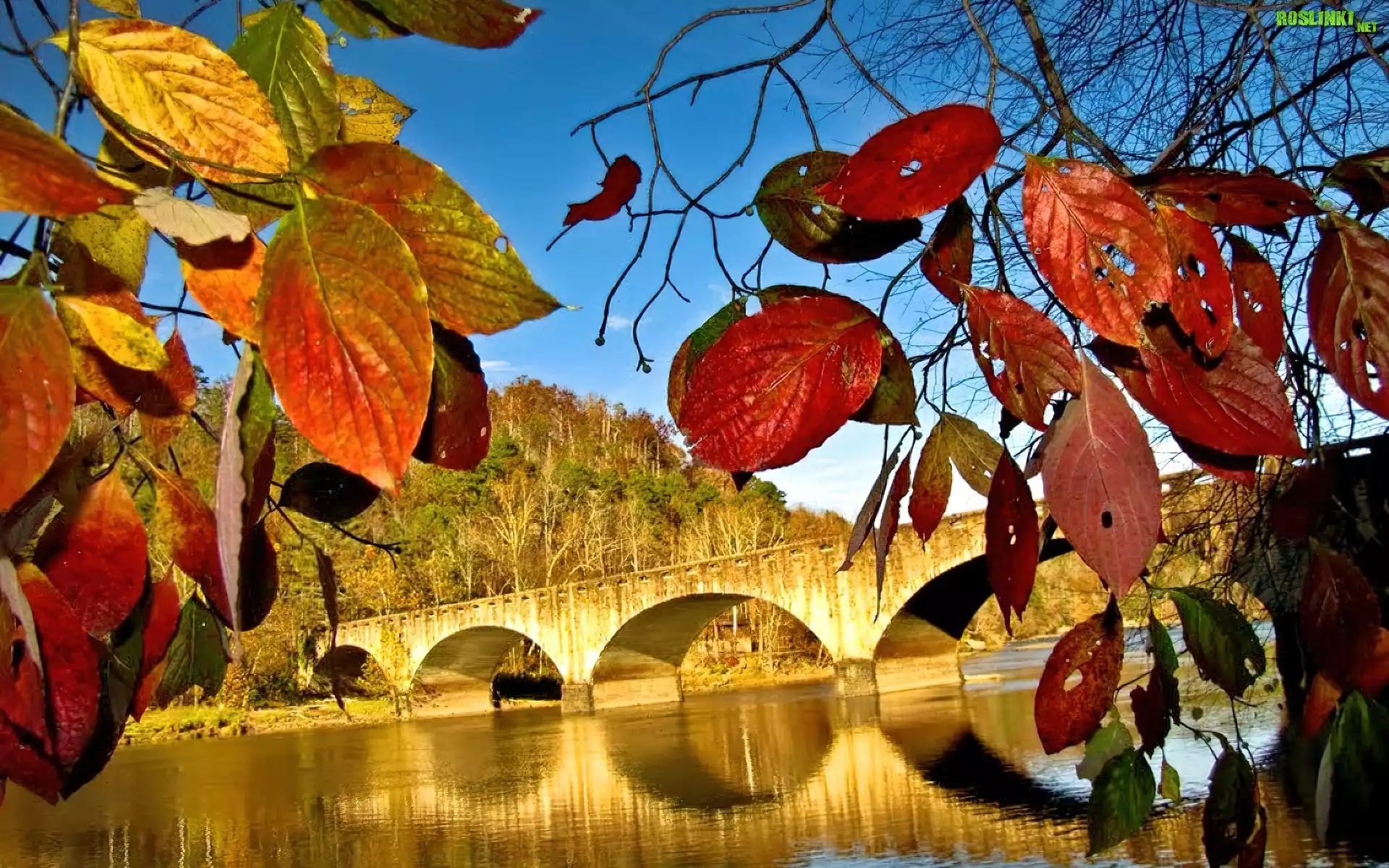 Rośliny: Jesień, Las, Liście, Rzeka, Most