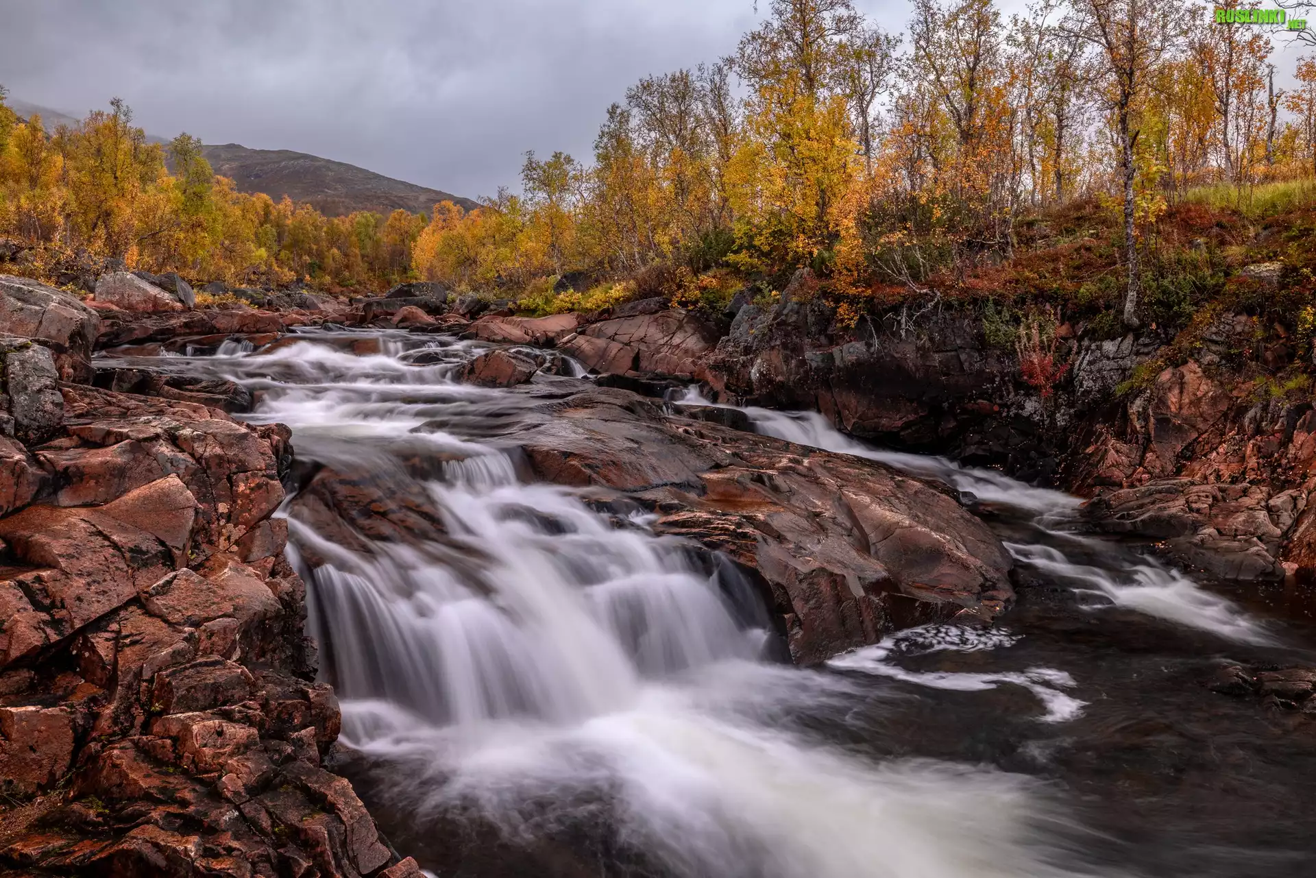 Rośliny: Jesień, Rzeka, Skały, Kamienie, Pożółkłe, Drzewa, Góra, Wyspa Senja, Norwegia