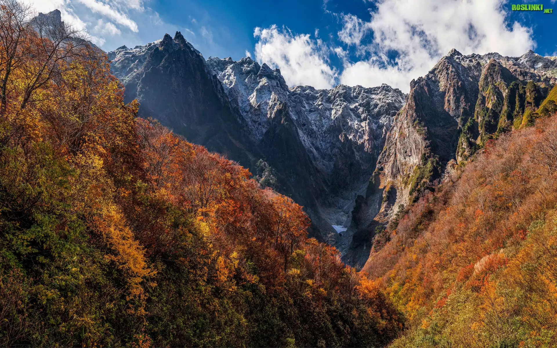 Rośliny: Jesień, Las, Pożółkłe, Drzewa, Krzewy, Góry, Skały, Chmury, Wąwóz