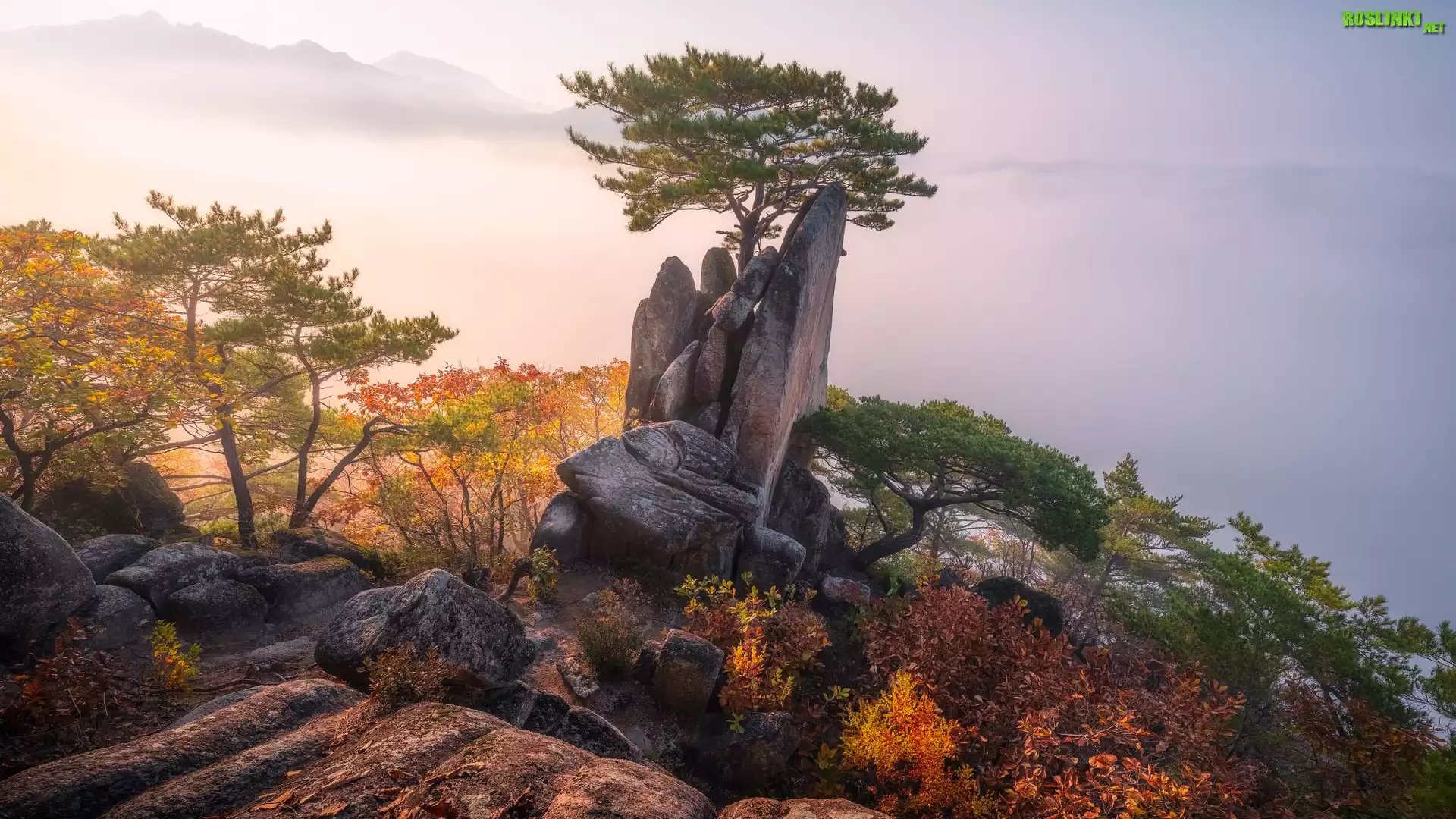 Rośliny: Skały, Drzewa, Mgła, Jesień