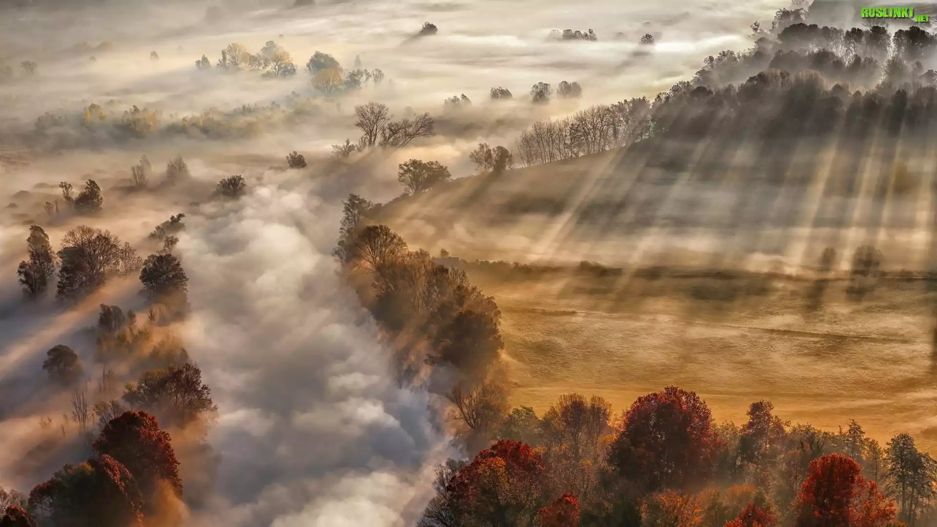 Jesień, Mgła, Poranek, Promienie słoneczne, Drzewa