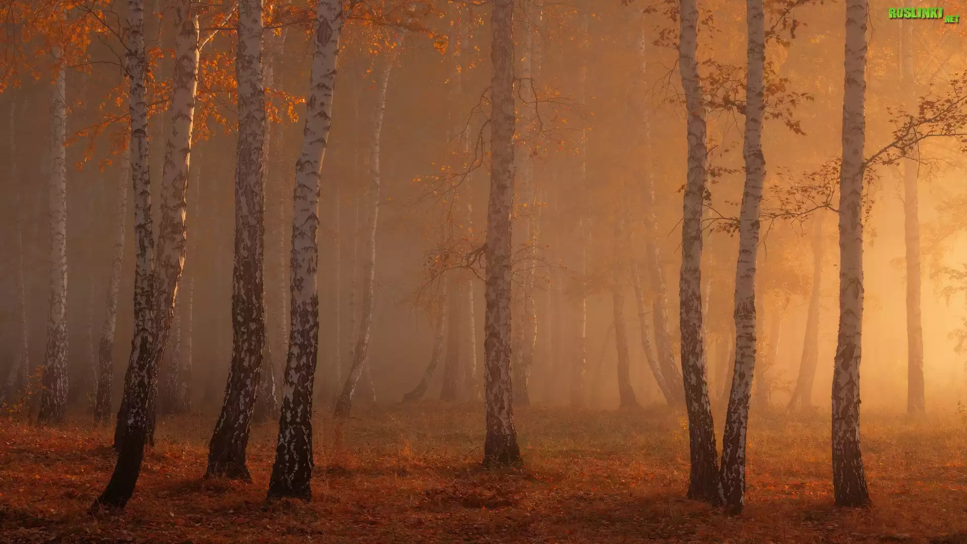 Rośliny: Jesień, Las, Brzozy, Mgła, Słoneczny blask